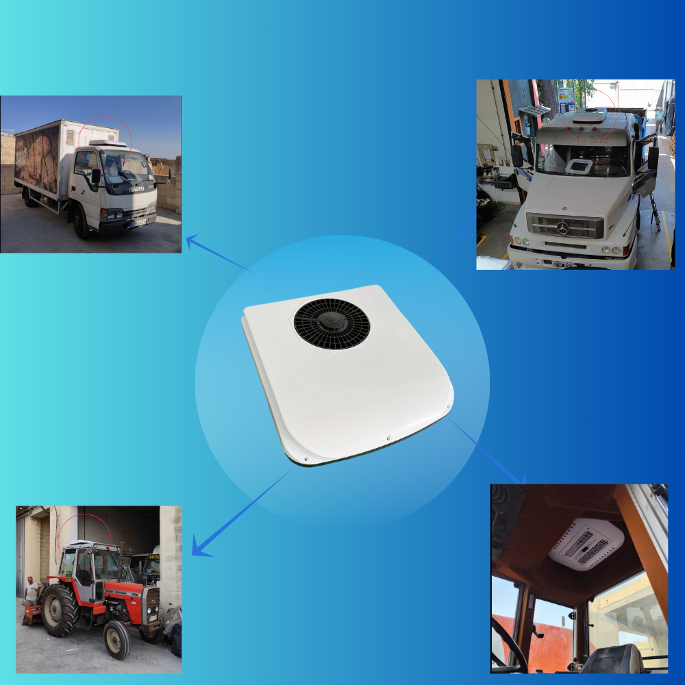 The 12V/24V rooftop AC unit offers efficient cooling for vehicles, ideal for trucks, RVs, tractors, forklifts, cranes, vans and so on.